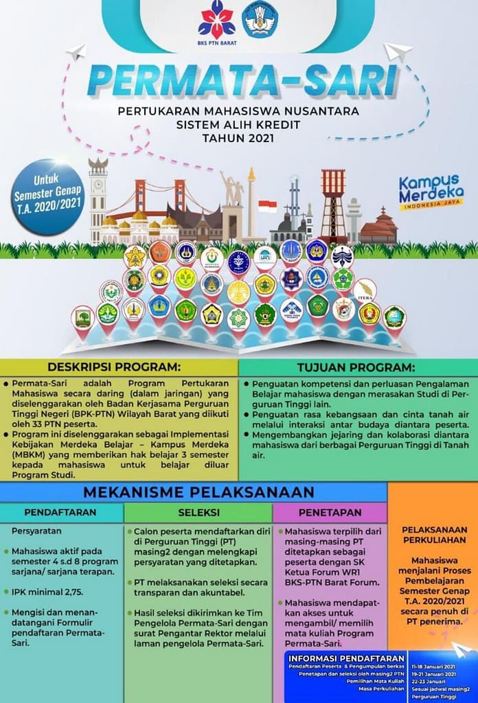 Permata Sari adalah sebuah program PERTUKARAN mahasiswa antar PTN di Seluruh Indonesia Wilayah Barat, dimana setiap PTN dapat MENGIRIM dan MENERIMA mahasiswa dari dan ke PTN lainnya di Indonesia Wilayah Barat, untuk menempuh perkuliahan baik pada Program Studi yang SAMA, maupun pada Program Studi BERBEDA selama satu semester penuh, guna mendukung Program Merdeka Belajar & Kampus Merdeka Kemendikbud R.I.